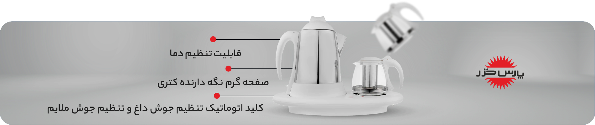 صفحه گرم نگه دارنده کتری | محدوده توان مصرفی 1500 تا 2000 وات | طول سیم 0.9 متر | محدوده ظرفیت کتری ۱.۵ تا ۲.۰ لیتر | دارای دو کلید روشن و خاموش روی کتری و روی سینی | کلید اتومایتک تنظیم جوش داغ و تنظیم جوش ملایم | دارای دو ترموستات جهت المنت هنگام خشک شدن آب داخل کتری | دارای فیلتر چای ضد زنگ | قابلیت استفاده همزمان دو قوری