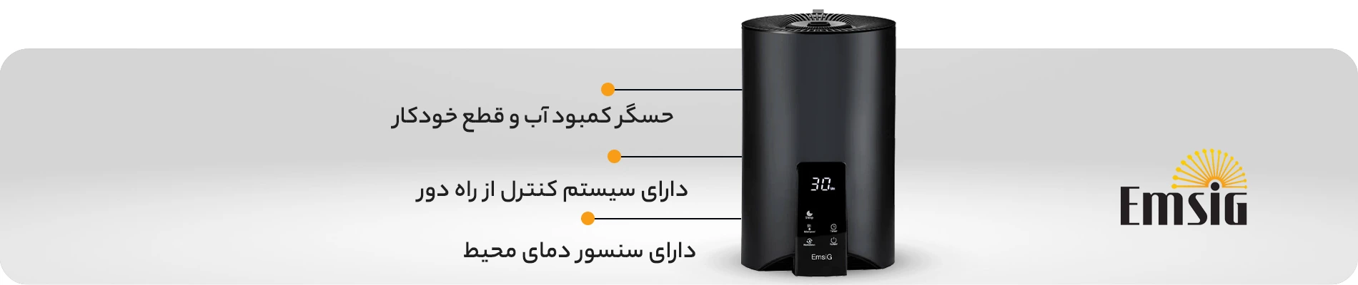 دارای زمان سنج | دارای سیستم کنترل از راه دور | حسگر کمبود آب و قطع خودکار | دارای سنسور دمای محیط | مخزن آب نشکن | نازل خروجی 360 درجه | بدون تغییر دما و عملکرد بی صدا | پر شدن مخزن از بالا بدون جداسازی (Top Filling) | مجهز به رطوبت سنج | کارکرد تامین رطوبت محیط، حذف ذرات معلق | سیستم خاموشی اتوماتیک | دارای سنسور سنجش رطوبت | نمایشگر دیجیتال با قابلیت دید در شب | دارای نور پس زمینه نمایشگر